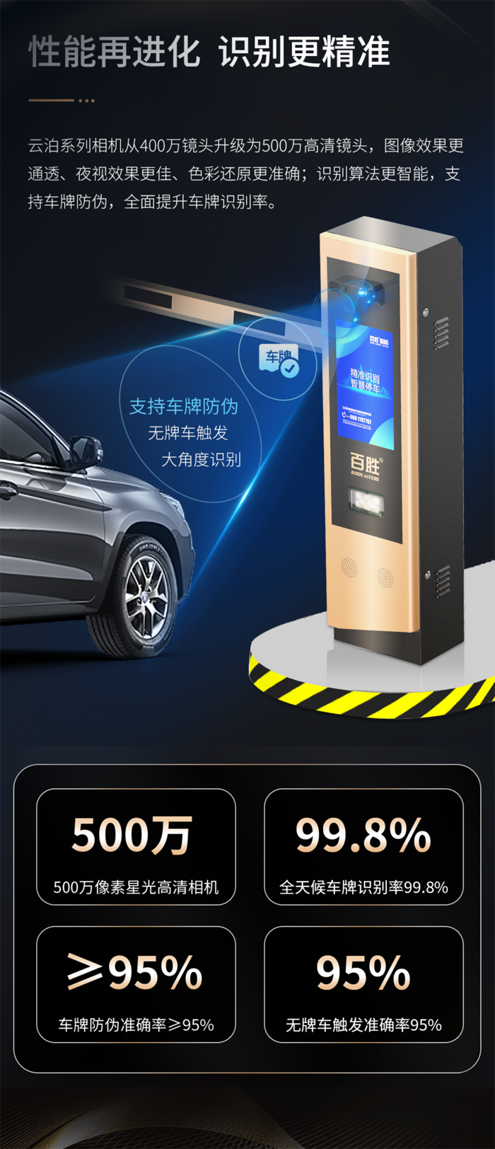 云泊系列相機(jī)從400萬鏡頭升級為500萬高清鏡頭,圖像效果更通透、夜視效果更佳、色彩還原更準(zhǔn)確;識別算法更智能,支持車牌防偽,全面提升車牌識別率。
