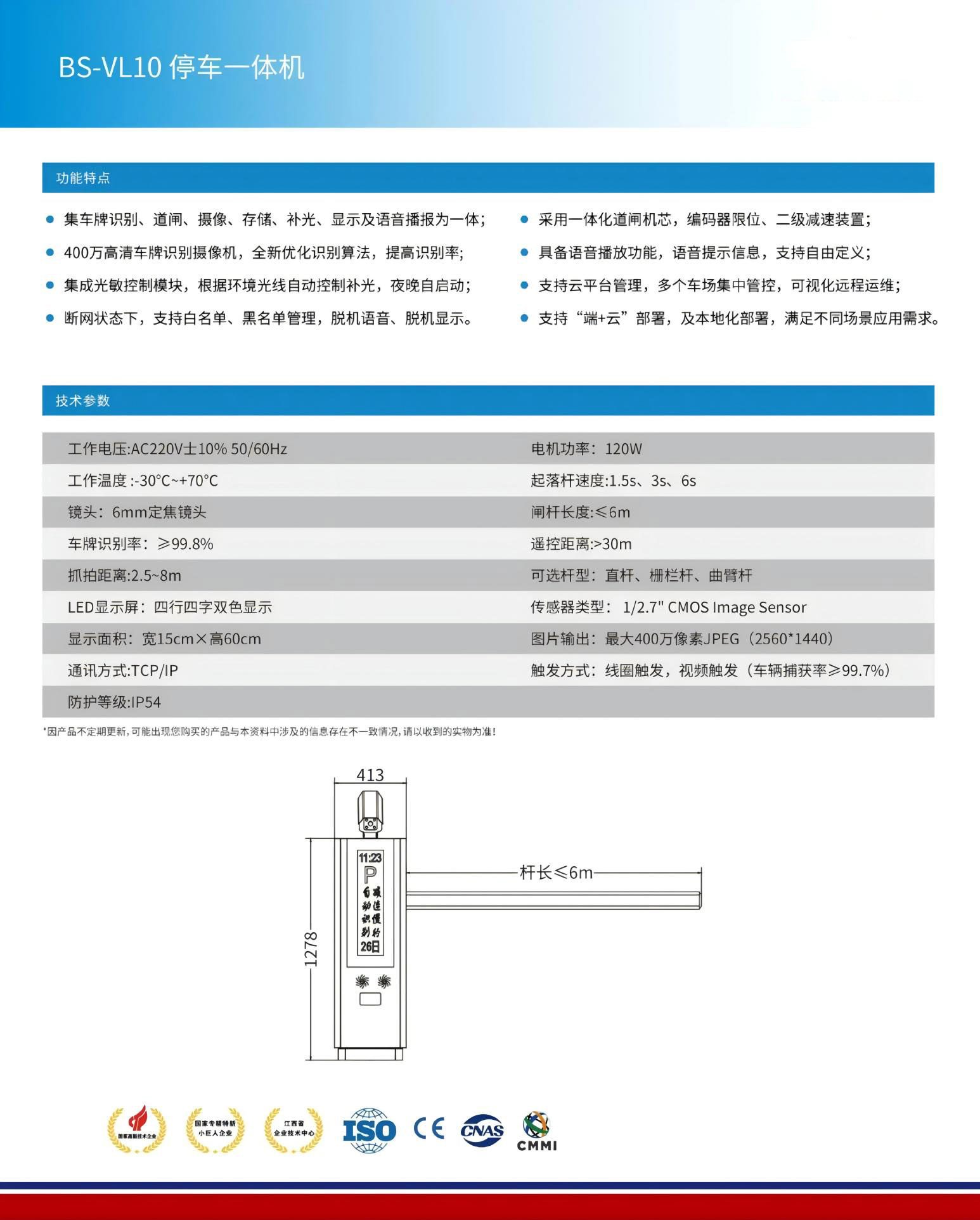 ●集車牌識(shí)別、道閘、攝像、存儲(chǔ)、補(bǔ)光、顯示及語音播報(bào)為一體;